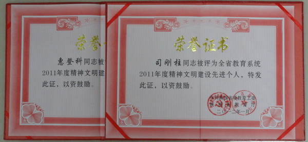 从2月27日召开的“全省教育系统2012年度精神文明建设和宣传思想工作会议”获悉,石油普教中心荣获全省教育系统2011年度精神文明建设和宣传思想工作先进单位,泾河工业区中心学校荣获“文明校园”,惠登科、司刚柱两同志荣获精神文明建设先进个人。