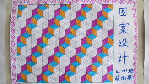 三年级数学组给学生提供设计展示平台的平台,让学生利用课堂学习的平移与旋转的知识,设计出美丽的图画。为了让学生将自己的设计与想法展示出来,在本年级中进行设计评比,学生探究学习的热情很高,既锻炼了学生的动手能力,又培养了他们联想想象的能力。