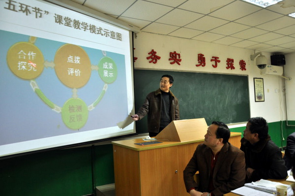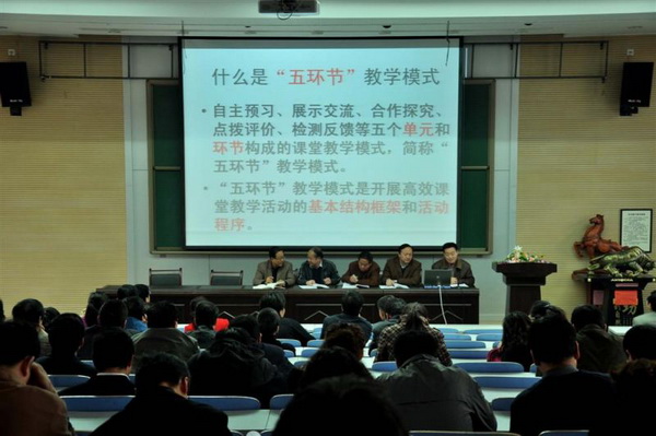 2月25日该校召开2012年首期教育教学推进工作研讨会,教研室蒙主任为与会的学校领导、各年级组长、各教研组长及各部门负责人介绍了“五环节教学模式”。