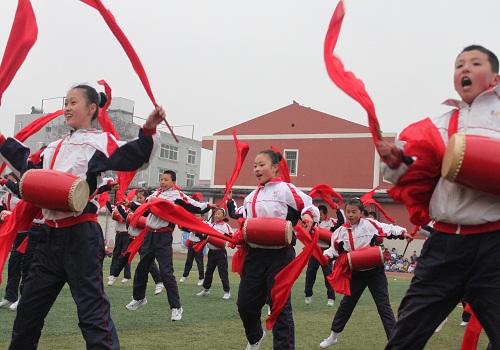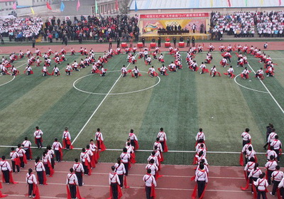 首次“校园文化广场”展示项目为五年级组全体师生的“安塞腰鼓”表演,展示分集体表演和分组表演,队员们舞着鲜红的彩绸,踩着雄壮的鼓点,喊着嘹亮的口号,表演场面宏大,气势磅礴,给人以极大的震撼力。