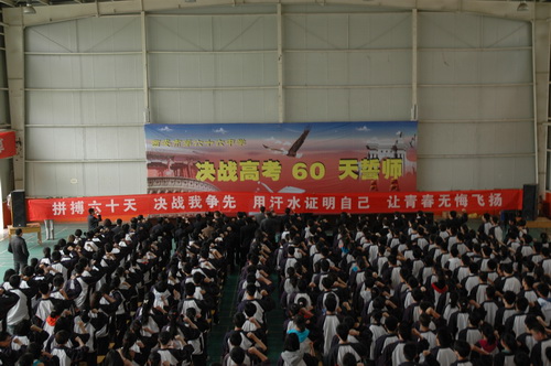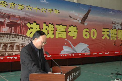 常务副校长席进忠代表学校致辞。他对最后六十天的复习工作向学生和任课教师提出了新要求、新希望,并勉励大家增强信心,团结一心,争创佳绩。年级组长赵明代表全体高三教师作了表态发言。高三年级九个班级的学生在班主任老师的组织下依次宣誓,表示将在今后六十天里全力以赴,绝不辜负父母和恩师的愿望。他们的誓言充满自信,情绪激昂,表达了六十六中学子的心声。