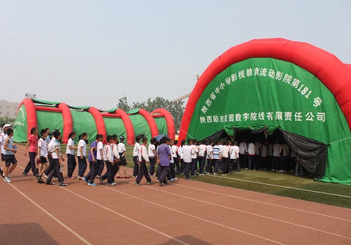 在学校操场上搭建的流动放映帐篷,引起了同学们极大的兴趣,在排队进入时,同学们情绪高涨,异常兴奋。根据学生人数较多、天气炎热的实际,学校制定了活动应急预案,周密部署,精心组织,采取分年级、分场次放映的办法,确保所有学生都能参加。