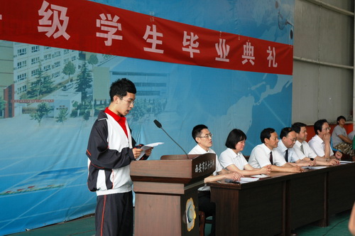 毕业典礼由王金江副校长主持。首先,康俊杰书记发表了热情洋溢的祝词,他对本届高三年级的工作给予了充分肯定,对全师生三年来的不懈努力给予了高度赞扬,对同学们在学习及综合素质等方面所取得的显著进步表达了由衷的欣喜,并希望同学们树立信心,在高考中再创佳绩。