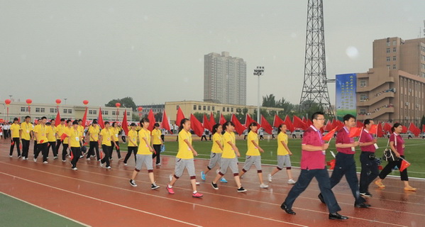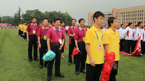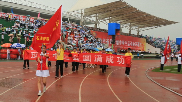 据悉,本届运动会由陕西省教育厅、省体育局主办,杨凌示范区管委会承办,陕西省学生体育协会协办。运动会共设田径、篮球、乒乓球、健美操四个比赛项目,在7月2日至6日为期4天的比赛中,来自全省各市(区)13个代表团的783名运动员将展开激烈角逐。 石油普教中心代表队走过主席台 开幕式上,在参赛的13个代表团中,石油普教中心代表团标志醒目、旗帜鲜明,队列整齐,精神饱满,第五个走过主席台进入开幕式会场。 石油普教中心代表队迈着整齐的步伐入场 石油普教中心代表团的28位运动员分别来自其所属的西安市第六十六中学、西安泾河工业区中心学校,长庆八中三所学校,将代表该中心参加本届运动会的田径、健美操两个大项的比赛。