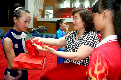省教育厅体卫艺处处长祝亚肖为获得第一名的代表队颁奖