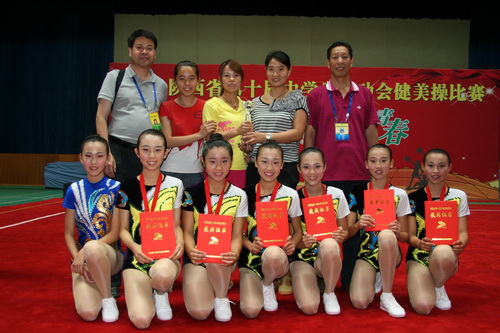 上场前,再次调动孩子们的情绪,比赛中不断给他们加油鼓劲,让她们兴奋起来。比赛结束后总裁判长主动邀请我们的健美操队员与其他裁判员一起合影留念,西安市健美操带队老师直感叹“你们的进步太大了,与去年相比,简直是突飞猛进呀!这些孩子就是比赛型选手,太让人佩服了”