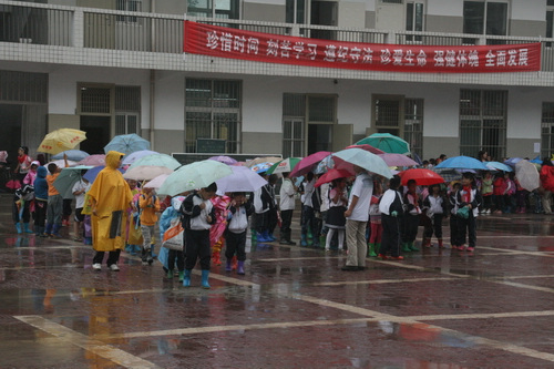 该校门口正临道路改建施工,推起的土堆如丘似山。开学前为方便师生安全出入,学校协调相关政府部门推出一条便道,适逢连天降雨,由于路面地势较低,便道顿成水塘,给学生上下学带来极大安全隐患。针对这种情况,学校要求班主任及时教育提醒学生注意交通安全;德育处给学生家长下发《告家长书》,要求学生家长接送孩子上学放学;学校领导带领校办、安全部门、值周教师、门岗保卫人员集体出动,雨中组织学生、接送家长和出入车辆进出校门,在校门、便道至安全路面每个节点安排人员,“手把手”护送学生走过泥水道路,全方位确保学生人身安全。