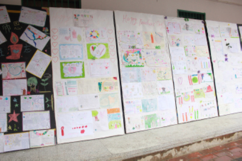 9月10日早晨, 八块展板在校园里格外醒目,许多教师和来宾纷纷驻足观看。看着孩子们用自己的方式表达对老师的尊敬和感谢,很多老师都非常感动。