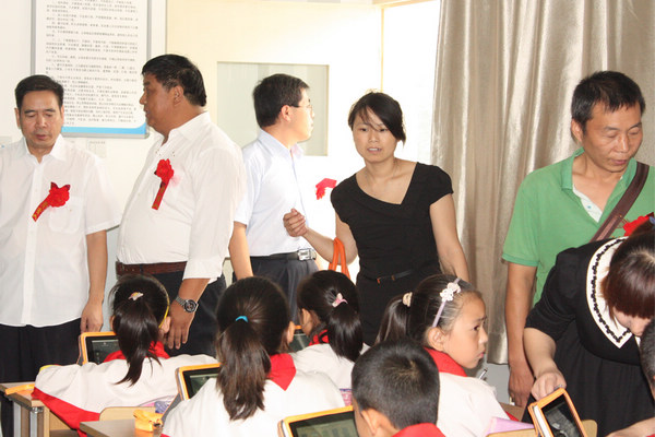 会议最后,由陕师大副院长张文兰、泾渭小学校长肖志峰、立人科技总经理岳林共同签约,并为学生配发电子书包。会后,各位领导及来宾们进行了课堂观摩,并参观了长庆泾渭小学各功能教室和校园文化建设。