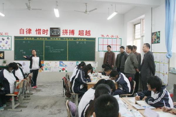 检查组一行来到八年级一班教室时,学生们起立鼓掌欢迎,学生代表简要介绍了该班基本情况、班级文化建设、高效课堂学习等内容,她大方自如、流利顺畅、吐字清晰的介绍给大家留下了深刻的印象,也展示该校在推进课堂教学改革中培养学生综合能力的成果。