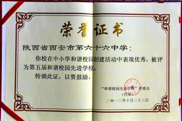 联合办学以来,学校领导始终把创建平安和谐校园作为学校办学的首要目标。平安是和谐校园的基础,把安全意识贯穿在学校工作的始终,并且肯动脑筋、想办法,建立了一套行之有效的确保校园平安的长效机制。从2005年企地联合办学至今,师生校内外不安全事故发生率为零,师生违法犯罪率为零。和谐优良的校内外环境为学校的快速发展奠定了坚实的基础,学校整体办学质量显著提高,实现了跨越式发展。2007年六十六中晋升为陕西省标准化高中。学校先后被评为陕西省中小学德育工作先进集体、陕西省教育系统文明校园;2008、2009连续两年被西安市经开区公安分局评为内部治安保卫“先进集体”;2011年被评为陕西石油普教中心安全稳定工作先进单位,受到表彰奖励。