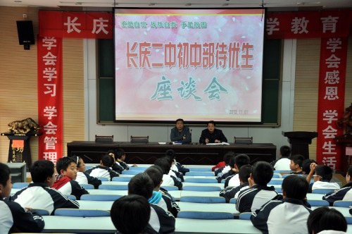 2012年11月1日下午,长庆二中召开初中部待优生(亦称学困生)座谈会,该校德育处负责人与49名待优生倾心畅谈,他结合自己教学生涯,以鲜活生动的事例,妙趣横生的实践体验游戏,高亢激昂的呼号,帮助他们重新认识自我,重树理想信念,取得了良好的教育效果。