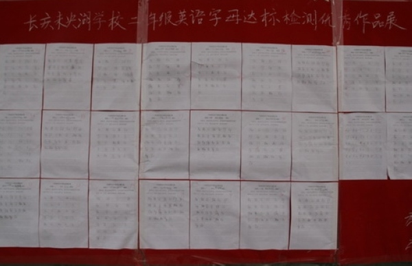 通过精心组织,低年级学生们有序进入测试现场,大部分学生的书面书写规范、认真,口语表达发音准确,镇定流畅。测试活动结束后,教务处选取了部分优秀书面书写作品进行了集中展示。