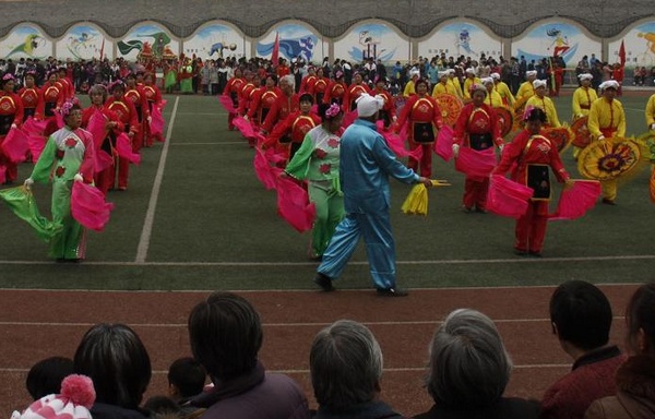 礼泉基地社火队由长庆油田礼泉生活社区的退休职工和家属人员组成,大部分成员是该校学生的爷爷奶奶。表演活动中,老人们脸上化着彩妆,身着亮丽的演出服,个个精神抖擞,扮演的角色神情逼真,惟妙惟肖。社会表演内容丰富,有舞龙、跑旱船、赶毛驴、抬花轿、太极扇子舞、腰鼓,扭秧歌等等。尤其是在扭秧歌表演过程中,社火队花伞、扇子上下翻飞,队形变化复杂,引起了教师和学生们的一阵阵掌声。整个演出在领唱人宽广浓郁的陕北歌声中结束。