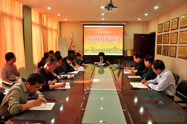 2013年4月18日下午,长庆二中对在本校已经开展的以“自我服务、自我教育、自我管理、自我提高”为主题、以班级事务管理为主要内容的校内实践活动所遇到的关键问题、疑难问题进行了研讨。该校领导、年级组长、全体班主任、相关部门负责人参加了研讨活动,研讨会由德育处黄建军主任主持。