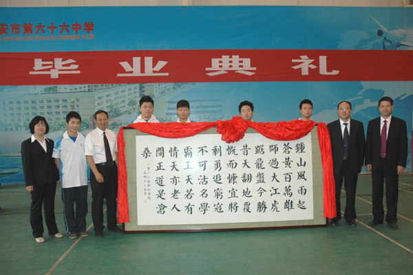 在毕业典礼上,学校领导向同学们颁发了高中毕业证书,并向三年来各方面表现突出的学生颁发了优秀毕业生证书。高三学生为母校赠送了由高三·二班孟刚同学书写的毛泽东诗词《人民解放军占领南京》大型匾幅。随后,学生代表还向高三老师献花,表达他们对母校和恩师的感恩之情。高一、高二学生为学长们献歌,加油壮行,表达他们的良好祝愿;高三师生合唱的《我心飞翔》再次将会场气氛推向高潮。