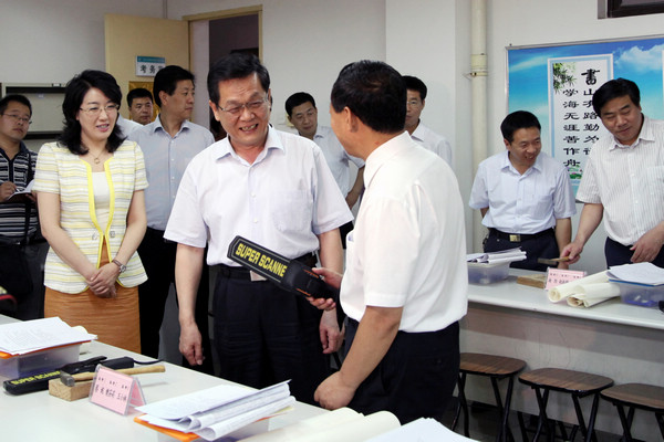 在考务办公室,董市长查看了考试用品准备情况,现场观看了金属探测仪的演示。最后,董市长来到保密室,查看了保密柜、监控摄像头等设施,询问了保密人员安排情况和近年来保密工作任务完成情况。李婧副市长现场叮嘱保密人员,一定要尽心尽责做好保密工作。董市长对六十六中考点准备情况表示满意,同时叮嘱六十六中领导一定要精心组织,抓好细节落实,确保高考顺利进行。