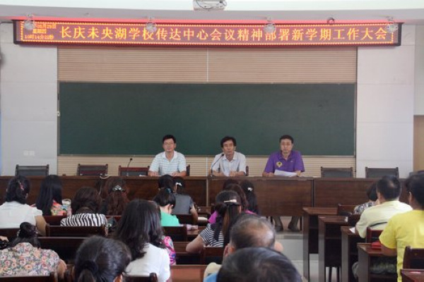 2013年8月29日上午,长庆未央湖学校召开新学期教职工大会,组织学习中心2013年质量分析会议精神,部署新学期工作。会议由该校校长何胆孝主持,全体教职工参加了会议。
