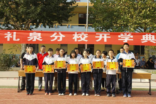 在典礼上,首先为上年度毕业班优秀教师佩戴红花,正是他们的坚持不懈、默默耕耘,学校才有今天的进步和发展。接着由副校长张峰宣读优秀班集体、优秀学生、优秀学生干部、五星级自主管理优秀干部及中学优秀小组长的表彰决定并颁奖,由德育主任陈拥军宣读授予三名同学“拾金不昧好少年”称号的决定。学校号召全体同学以他们为榜样,从小就要立志向、有梦想,积极践行“陕西精神”,传递正能量。最后,校长屈伸发表新学年致辞,他希望大家深入开展党的群众路线教育实践活动,以“中国梦我的梦”为主题,立足本职工作,让自己得到提高和发展,使学校各方面工作取得更大成绩。
