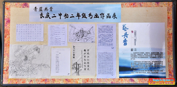 本次书画展共展出初二年级组师生书画作品80余幅,这些作品,虽然还不够精美,不能成为精品,甚至还很稚拙,但它充分表达了师生们对祖国的热爱之情和为实现中国梦而努力奋斗的坚定信念,又为师生切磋书画技艺提供了展示平台,丰富了校园文化生活。