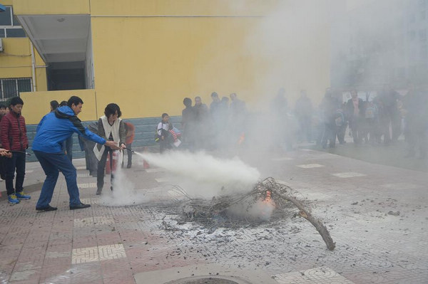 为了使此项工作落在实处,安保处进行具体部署,主要开展以下活动①11月4日晨会上六年级2班张佳怡同学做了《消防安全》国旗下讲话;②下午各班召开《认识火灾,学会逃生》主题班会;③各班办了以119消防安全知识的黑板报;④对校园的安全消防设施进行了全面检查;⑤对功能室的管理老师进行灭火器的使用培训,并进行现场灭火演练;⑥11月8日下午第二节课后举行了紧急疏散演练活动。演练前,学校制定了安全可行的紧急疏散预案,成立了演练活动领导小组,明确责任与分工;召开了教师会议,布置演练工作,并学习了“逃生方案”,强调要严格遵守演练步骤,严格把握演练要求,迅速、及时、安全地进行疏散,尤其要注意楼梯口的安全,严防因拥挤而造成踩踏事件。演练时,随着演练警报信号的响起,全校900余名师生迅速撤离到操场空旷的安全地带。整个演练过程历时不到2分钟,演练活动取得圆满成功。随后,副校长田宁苏对演练活动进行了总结并对全校师生进行消防安全教育。