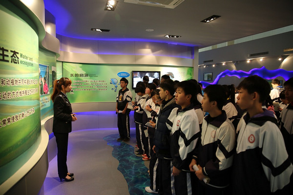 同学们在解说员的带领下,漫步其中。一张张图片、一件件展品,让同学们驻足观看,一句句解说、一幕幕视频让同学们惊叹不已。看着120度环幕环保警示电影《我们的地球》展现人类对地球生态环境的破坏和地球对人类的惩罚,同学们陷入了沉思。看着一幅名为《洗脸》的照片中,一位母亲端着半碗水,喝一口含在嘴里,向紧挨在一起的孩子脸上喷去,同学们的眼眶湿润了;看着中水回用,同学们的脸上又露出了欣慰的笑容。