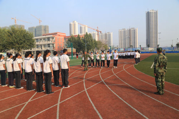 抓好军训,练好队列队形。初一学生年龄小,又是第一次进行军训,为了搞好军训,学校制定了训练计划,专门安排德育处两位老师和班主任一起配合训练。为使动作规范到位,专门聘请了油田两位退伍的特种兵来指导训练。从25日到29日,每天早上8:30到10:30,学生在教官的带领下,进行严格的训练。立正、稍息、转身,一个小小的失误,教官马上就停下来纠正。严厉的教官、紧张的训练,激发起学生的热情,站队、转身、行走,井然有序。