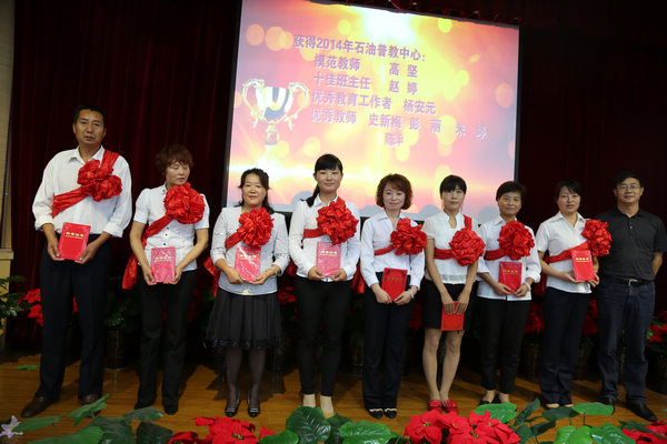 会上,石油普教中心人事部副主任司刚柱宣读了中心《关于对模范教师 、“十佳班主任”、 优秀教师、优秀教育工作者进行表彰奖励的决定》;长庆泾渭小学支部书记芦长明宣读了《关于2014年教师节校级先进教师和优秀班主任的表彰决定》;长庆泾渭小学副校长杨军英宣读了《长庆泾渭小学关于2014年教师节优秀教育工作者等的表彰决定》;长庆泾渭小学副校长李筱敏宣读了《长庆泾渭小学关于师德标兵及师德先进个人的决定》。希望受表彰和奖励的先进个人能够戒骄戒躁、再接再厉,在新的学年里取得更加突出的成绩。大会组织领导和来宾为受表彰的模范教师和集体分别进行了颁奖。老师们倍受鼓舞,更加坚定了对教育事业的热爱和无悔的态度。