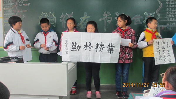 五年级语文老师引导学生围绕“遨游汉字王国”这一教材主题,展开活动。实践活动分为小组讨论和制订活动计划、举行猜字谜游戏;搜集有汉字谐音特点的歇后语、笑话;搜集有关汉字来历的资料,了解汉字的起源;搜集汉字字体特点及变化的资料,了解汉字的历史;进行社会用字调查,写简单的调查报告;搜集书法作品,举办书法展览;制作手抄报展示综合性学习的成果等。