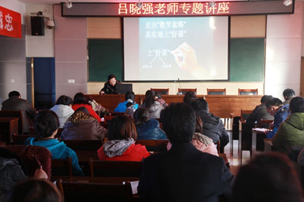 吕晓强针对该校课改过程中存在对问题,以自身丰富的教学经验、独到的视角,结合典型案例,具体、形象、生动地对课堂教学进行了解读,“要想真实地上好一堂课,必须得走出教学套路”。一是“好课”不一定是完美的,不要为了追求完美而上课。课堂教学过程是师生交往,共同发展的互动过程,是师生共同探究问题获取知识和形成能力的平台,课堂所追求的目标应该是真善美,而不是虚假,做秀,浮华的条框。课堂教学过程是预设与生成的和谐统一;二是教材与教案是教学的参考,不做他们的奴隶。应该大胆利用和整合各种资源;三是教学节奏由学生的知识水平决定,别被教学计划限制。要把学生的真实学习情况放在首位,以学生的知识水平指导教学节奏。四是教学的对象是孩子,不是理论家与学者。应该尽量选择易于学生理解,容易让学生产生兴趣的语言进行教学,在学生观察和感悟的基础上,不失时机地点拨和升华;五是用真情与关爱进行教学。用真情感化学生,用关爱激发学生的思维和学习动机。