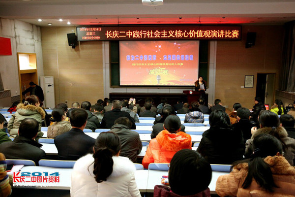 为了帮助教职工准确把握社会主义核心价值观的科学内涵,使社会主义核心价值观完全融入到全体教职工的精神世界中去,进一步坚定理想信念,坚持敬业奉献,弘扬传统美德和社会正气,提高教职工队伍思想素质和道德修养,增强教书育人的能力,长庆二中于12月24日下午4:00在该校阶梯教室举办了以“践行社会主义核心价值观、颂扬身边人和事”为主题的教职工演讲比赛。