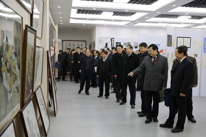 图为与会人员在西安市66中美术教室参观师生书画作品