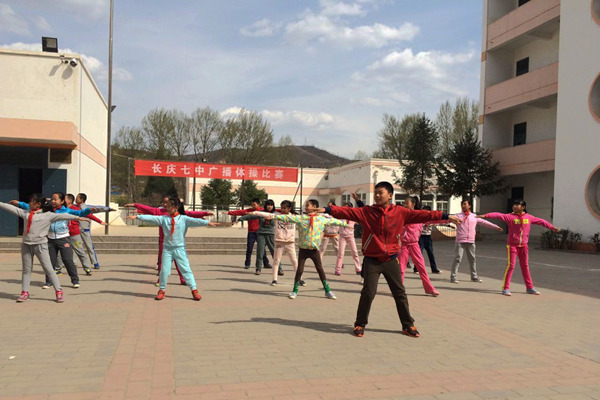为进一步丰富校园的文体活动,提高广播操质量,增强学生的健康意识,展示各班学生积极向上、团结活泼的精神面貌,长庆七中4月10日下午举行了第九套广播体操暨小学生校园快乐操《小苹果》的比赛。