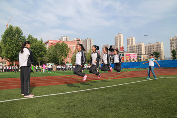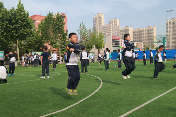 为贯彻落实“阳光体育运动”的有关精神和在学生中树立现代健康理念,切实加强学校体育工作,让每一个学生都能感受到运动的快乐,促进学生身心健康和谐发展,长庆未央湖学校把跳绳作为体育特色项目在全校蓬勃开展。体育教师充分利用体育课的时间,对学生进行科学、系统的跳绳训练、指导。学校将“快乐跳绳”纳入大课间行为艺术活动,做到“人人有跳绳,个个会跳绳,天天爱跳绳”,并设置了跳绳擂台赛,每年举办一次跳绳运动会。