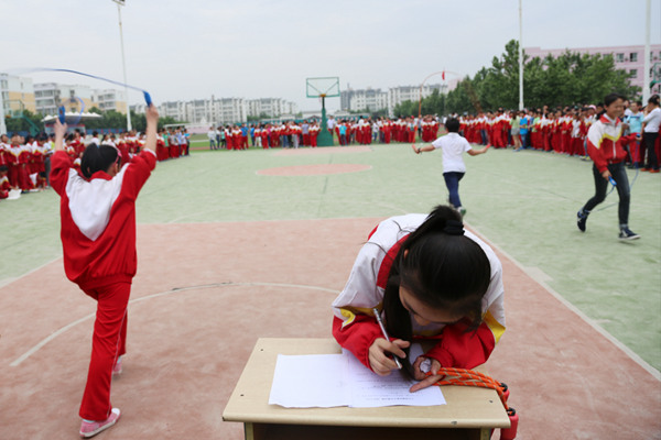 比赛中,参赛选手像箭一般向前冲去,脚步声和场外的欢呼声合奏着赛场交响乐,选手们一个接一个认真做题,个个不甘示弱。有的学生跑步稍慢,但是解题时,沉着冷静,一挥而就;有的学生还是速度和智慧的双赢家;有的学生健步如飞,却在数学题前眉头紧锁,豆大的汗珠都冒出来了,但在啦啦队热情的加油声中,最后还是顺利地计算出了题目。