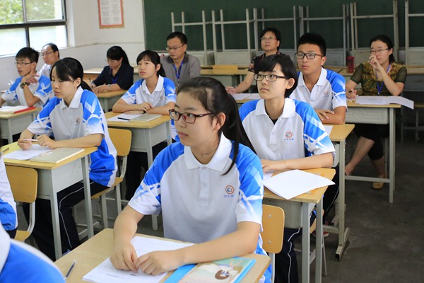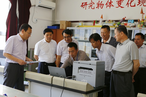 图为省教育厅、教科所领导、专家在六十六中赛点了解组织服务工作