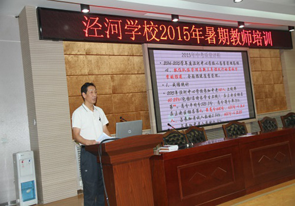 在培训会上,校长张布伦详细传达学习了中心2015年质量分析会精神,并做了学校团队建设专题讲座;郜建明副校长用详尽的数据对2015年教学质量做了细致分析和反思;教务主任马新驰做了课改通识培训;李潇和屈嫄两位老师做了《微课程和学科教学融合》的专题讲座。另外,还组织教师观看了上海北郊中学原校长郑杰校长的《教师职业与幸福》录像。