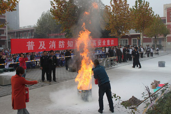 下午13时40分,校园广播播放火警警报,全校师生进行应急疏散撤离,同学们在老师的带领和指导下井然有序,不拥挤,不慌乱。疏散演练结束后,学校邀请龙凤园物业处治安大队邓队长对全校师生进行了消防安全教育活动,向师生介绍了家中常见火情发生原因及处置办法,并现场讲解和演示了消防栓、灭火器的使用方法。在治安大队保安的指导下,学校保安、实验室、库房管理、图书管理及部分功能教室的管理老师、初三学生代表16人分别用干粉灭火器、消防沙、毛毡和水四种灭火方法进行了现场灭火演练,学生对本次演练活动表现了极高的热情,经过现场实战演练,师生表示,通过参加这个活动,才发现消防安全就在我们身边,每个人都需要养成良好的家庭防火习惯,这样才能进一步提高全社会抵御火灾的能力。