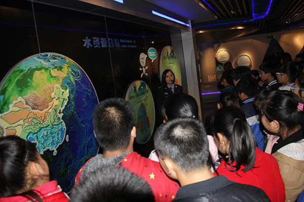 同学们在解说员的带领下,漫步其中。一句句解说、一幕幕视频让同学们惊叹不已,一张张图片、一件件展品,让同学们驻足观看。看着120度环幕环保警示电影《我们的地球》展现人类对地球生态环境的破坏和地球对人类的惩罚,同学们陷入了沉思;看着一幅名为《洗脸》的照片中,一位母亲端着半碗水,喝一口含在嘴里,向紧挨在一起的孩子脸上喷去,同学们的眼眶湿润了;看着中水回用,同学们的脸上又露出了欣慰的笑容。