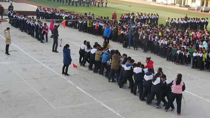 2015年12月29日和30日下午,礼泉分校举行了“迎元旦”拔河比赛,全校师生参加了活动。29日下午举行了预赛,在同年级间进行角逐,比赛采取3局2胜制,获胜年级参加30日下午的决赛。预赛按照从低年级到高年级的顺序进行,低年级的学生人小志气大,拔河中使出了全部力气,使比赛坚持了很长时间,周围的加油声、呐喊声一阵高过一阵。活动的高潮在初中部班级中展开,他们通过战术的布置,体力的科学分配,使拔河展现出别样的魅力,最终七(1)班实现大逆转,战胜了八、九年级,取得初中部的冠军。引起全校师生关注的是教工队和学生联队的比赛,学生们为自己的老师加油、呐喊,为自己的同学鼓劲、助威。经过艰苦的抗衡,男、女教工队取得了比赛的胜利,换来学生的阵阵欢呼。