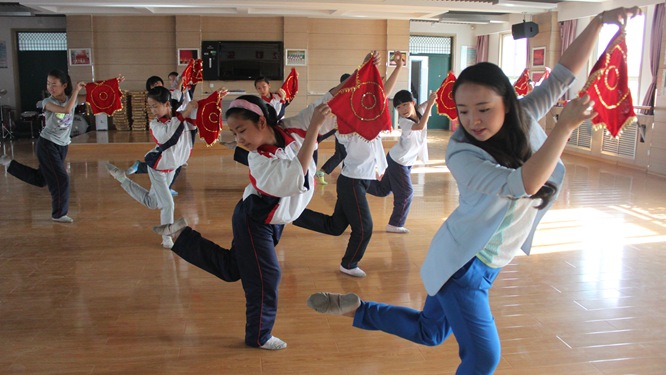 三是刻苦训练。曲目确定后,具体编排训练由陈璐、花玉香两位老师负责。她们从接受任务那一天起,就放弃休息时间,加班加点辅导学生进行紧张的节目排练。特别是陈璐教师从最简单、最基本的教起,一次次反复、枯燥的训练,不断的鼓励孩子们,更是采用多种不同的方案,让学生保持新鲜感:舞蹈节奏不好掌握,陈璐老师就让学生围成圈坐在地上,练听音乐打节拍;跳累了就坐着听音乐,只练上肢的动作,她们叫这样练为“坐着跳”,正常跳两遍之后再“坐着跳”两遍,以这种方式休息。2015年8月份,接到上级通知,节目进行现场展演。两位老师立即召集正在休暑假的孩子们进行排练。当时天气十分炎热,孩子们早晨训练完后,下午接着再训练,经过连续几天的高强度训练后,终于显现出了应有的效果。有一天,训练时间差不多到了,小演员们陆陆续续从教室来到排练室,花玉香老师清点人数发现少了一个学生,她向其她队员了解情况,“她说太累了,不想来了”,一个队员向老师汇报。其实负责的两位老师是很理解学生的苦衷,但是为了集体荣誉,花老师多次给家长打电话做工作,让把孩子送回来。那位同学回来时看大家正在练着,就从门口溜了进来,站到了自己的位置。事后老师没有批评她,只是对同学们说:“老师知道最近你们很累,其实老师也累,但是,为了我们的任务,为了我们肩上的责任,我们就要扛起比别人更多的东西,这对我们也是一种磨练。台上三分钟,台下十年功。舞蹈呈现给观众的是美,留给自己的则是坚定的意志。老师相信今天你们心灵上得到的东西,可能是其他同学几年、甚至十几年之后才能体会到的!”。一席话说的同学们又充满了激情和力量。