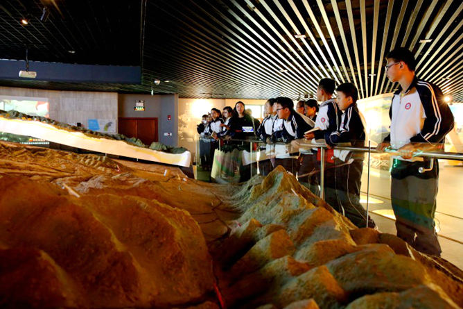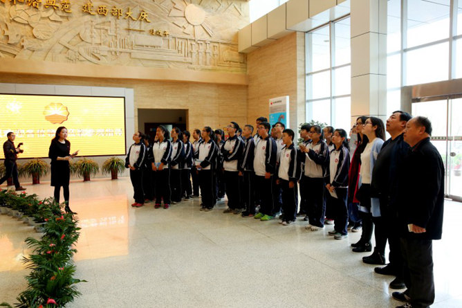 当师生们步入一楼序厅,眼前的情景,就深深打动了参观者,人们不禁为几代长庆人创业、创新,奋进、奉献的光辉历程和攻坚啃硬、拼搏进取的精神所深深感动。大厅中央主题为《崛起﹒长河》大型主题雕塑,向人们形象地展示了钻井工人风雨无阻、战天斗地的豪迈英姿,采油采气工人日夜巡井、一丝不苟的动人脚步,科技人员攻坚克难、技术攻关的感人身影,以及两代长庆石油人的光辉形象。有长庆人“跑步上陇东”的豪迈气概,也有长庆地质勘探队员们翻山越岭、找油探气的坚毅身躯。