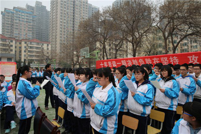 随后,2016届八个班的同学分别在大会上庄严宣誓:“奋战80天,给父母一个惊喜;给母校一个奇迹,让青春无悔,为未来点击。” 面对同学们铿锵有力的誓言,高三全体老师也向同学们表态:“请同学们放心,老师就是你们的坚强后盾,与你们同舟共济,为你们高考保驾护航。让我们共同挥洒汗水,斗志昂扬,奋战到底。让我们一起倾注热情,决战高考,创造辉煌!”。誓言铮铮,突显学子人生志气;情意切切,彰显教师职业境界。