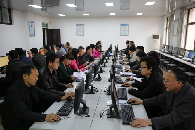 图为该校组织全体党员进行《党章》、《条例》、《准则》知识网上答题