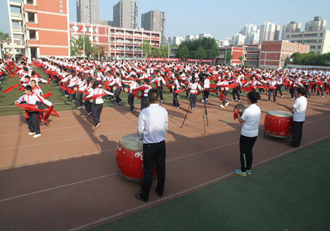随后,进行了体育、艺术项目展示活动。依次进行了三至六年级“韵鼓飞扬”千人腰鼓、一年级“快乐童年”打击乐、二年级的“安全伴我成长”交通手语操、六年级的“舞动中国”健身健美操、七八年级的“幸福律动”排舞及“青春活力”有氧舞蹈健美操等项目。宏大的场面、精彩的表演,欢快的鼓声,展示着学生们的自信与自强、毅力与品质,也展示了学校团结奋进、昂扬向上的团队精神,将开幕式一次次推向高潮,赢得了现场观众阵阵热烈的掌声。