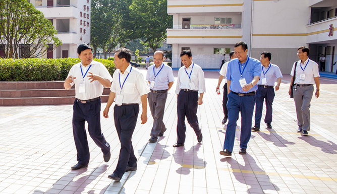 图为陕西省人社厅巡视员雷宝岐(前排左一)在六十六中赛教现场视察工作